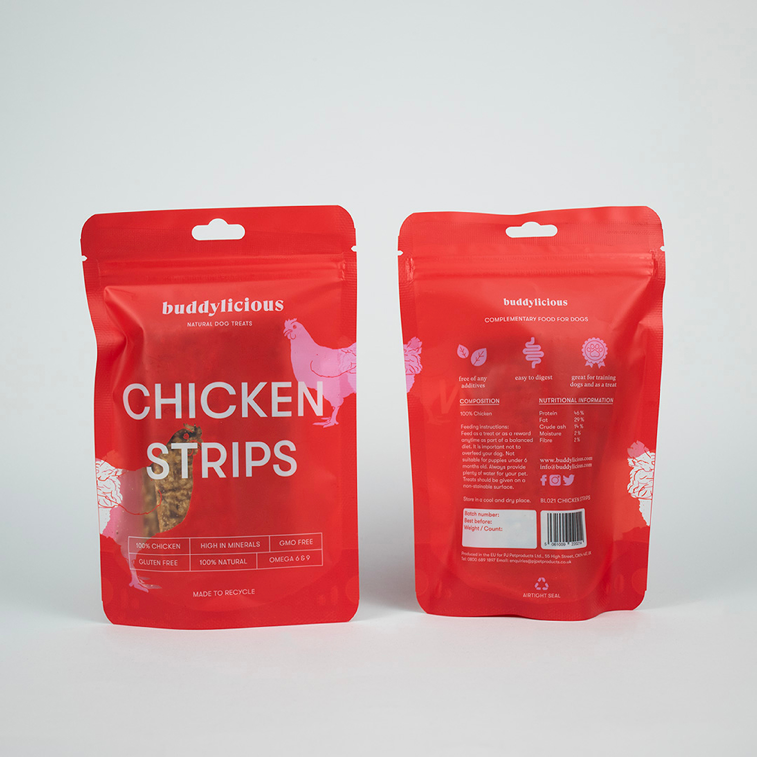 Indulge your pup with our delicious Chicken Strips, made from 100% natural chicken, air-dried to perfection. These treats are gluten-free, GMO-free, and contain high levels of minerals, omega 6 & 9, making them a healthy and tasty snack for your furry friend. Treat your dog to the purest form of chicken with our Chicken Strips.