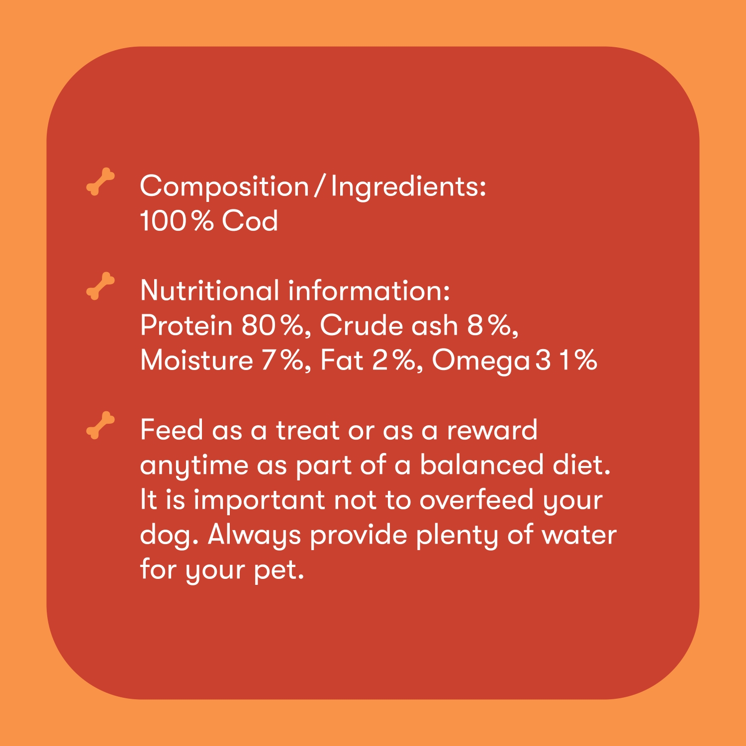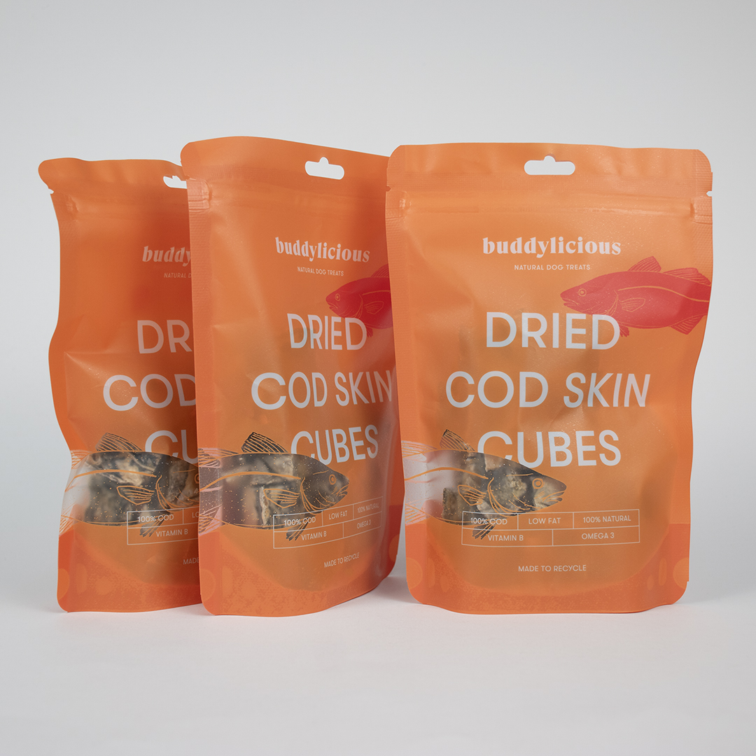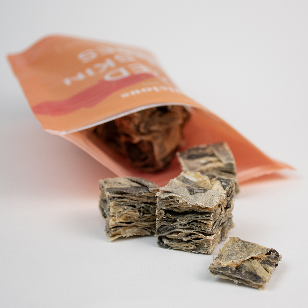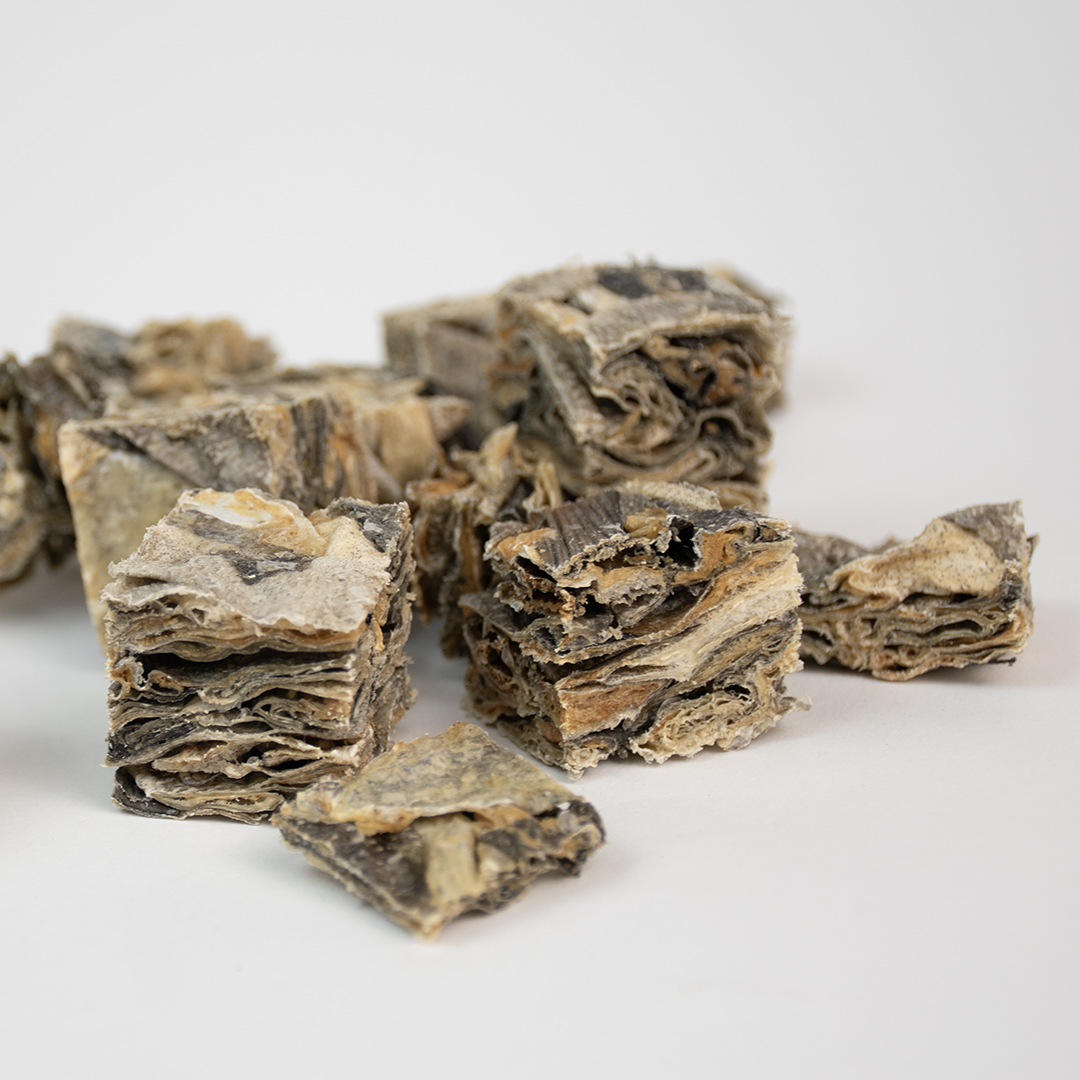 Our Dried Cod Skin Cubes are made from 100% natural cod, air-dried to preserve its nutritional value. Low in fat and high in vitamin B and omega 3, these treats provide a healthy and delicious snack for your dog. Treat them to the purest form of cod with our Dried Cod Skin Cubes.