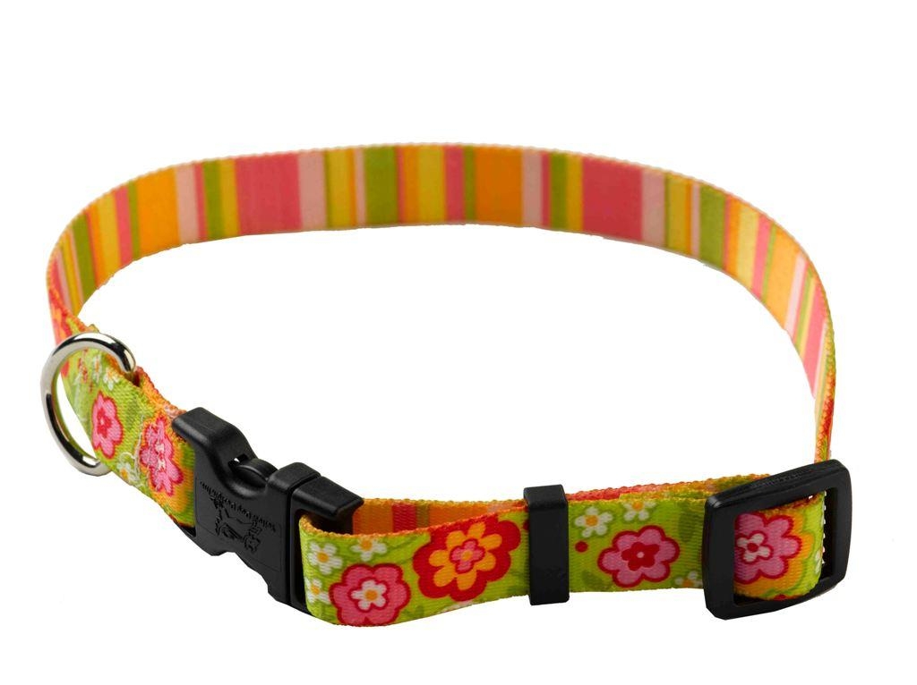 This is a fantastically bright, eye popping collar with Multi-coloured Flowers to the face and Stripes to the reverse. A distinctly retro 1960s feel, with the stripy inner lining contrasting fantastically against the hippie-chic floral outer design. Made from soft, colour-fast polyester, this collar is easily adjustable for a comfortable fit, and features a chunky plastic buckle that makes it simple for you to put on your pet with minimum fuss. Practical and fun, this is a ‘mutt-have’ accessory for the fashion-conscious dog owner. Why not add the Green Bouquet with Stripes matching lead to complete the look?
