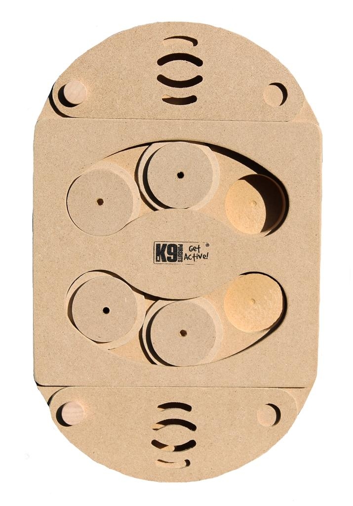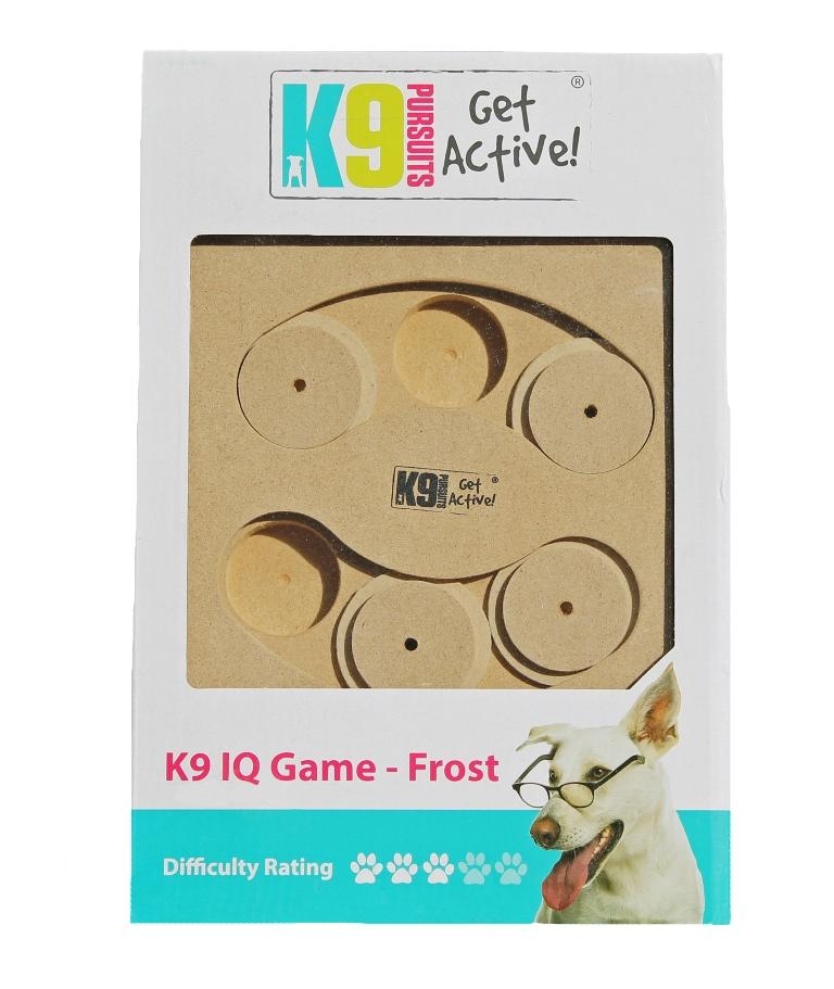 Bring out the super sleuth in your dog! The K9 Pursuits Interactive IQ game Frost made from wood, is designed to give dogs a fun treat seeking task that will challenge and keep them occupied for hours. Frost has a difficulty rating of three paws. Frost comprises of three sections. Both the top and bottom sections have a a sliding cover panel complete with aroma apertures which reveals a hiding cup underneath to place treats in. The central part of the K9 Pursuits IQ game Frost has six cups partially covered by four sliding covers. Plenty of action to keep your super sleuth busy! Both product and packaging made from 100% recyclable materials. Size: 2.4cm Depth x 30cm Height x 19cm Width.
