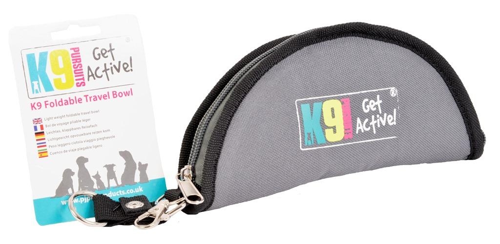K9 Pursuits K9 Foldable Travel Bowl is great for for trips out and about as it folds flat and is zipped up for carrying and then when needed can be unfolded to open out completely to form a travel bowl which can be used for water or food. The K9 Foldable Travel bowl is made from a super tough waterproof grey fabric with a fully cleanable lining in orange colour which is also waterproof. Features are a carabiner clip and a metal ring for attaching to other items or to add items such as poo bags etc. K9 Pursuits branding is featured. Size when open: 10cm high x 19cm diameter. Size when zipped up: 9cm x 19cm excluding metal work.