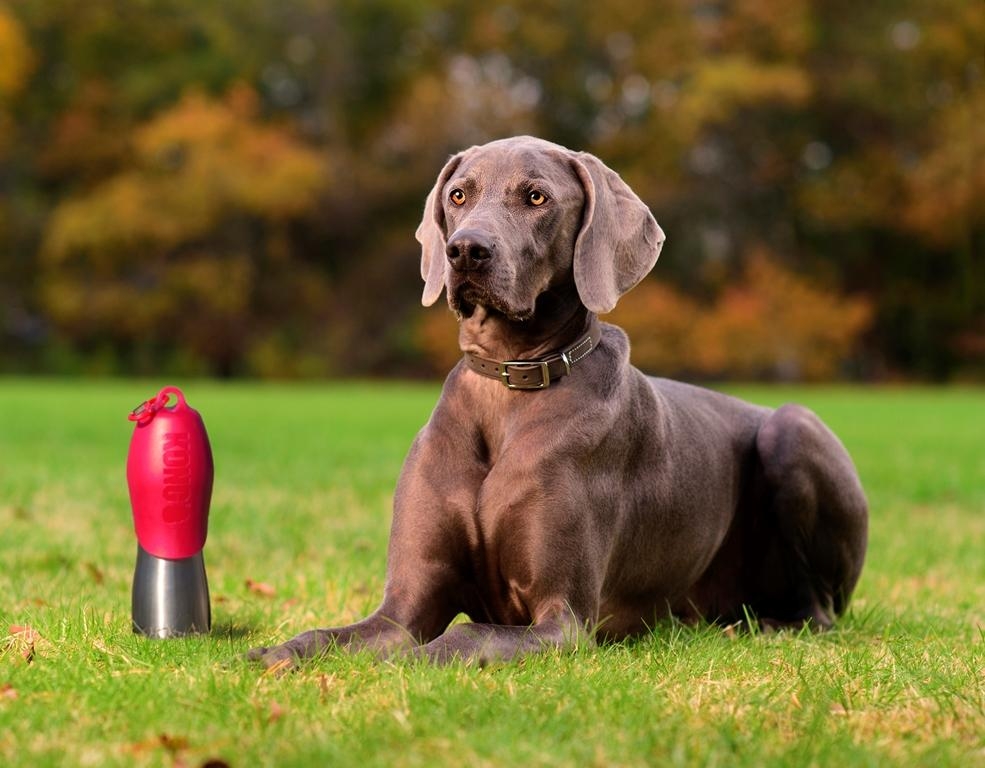 KONG H20 water bottle for dogs. Every dog needs water when out whether being exercised or at play keeping them hydrated. Made from 18/8 food grade stainless steel, the screw top lid made from a toxin free Polypropylene has been designed to accommodate a dogs natural drinking style.  Also incorporated is a food grade silicone gasket to keep the bottle water tight and a colour co-ordinated carabiner clip. KONG H2O is 100% recyclable. These 25oz (700ml) bottles are designed for larger dogs and are all available in Stainless Steel (Silver) with 7 different colour lids; Pink, Yellow, Orange, Green, Blue, Black and Red.  Why not team up with the KONG CADDY, the adjustable neoprene bottle holder?