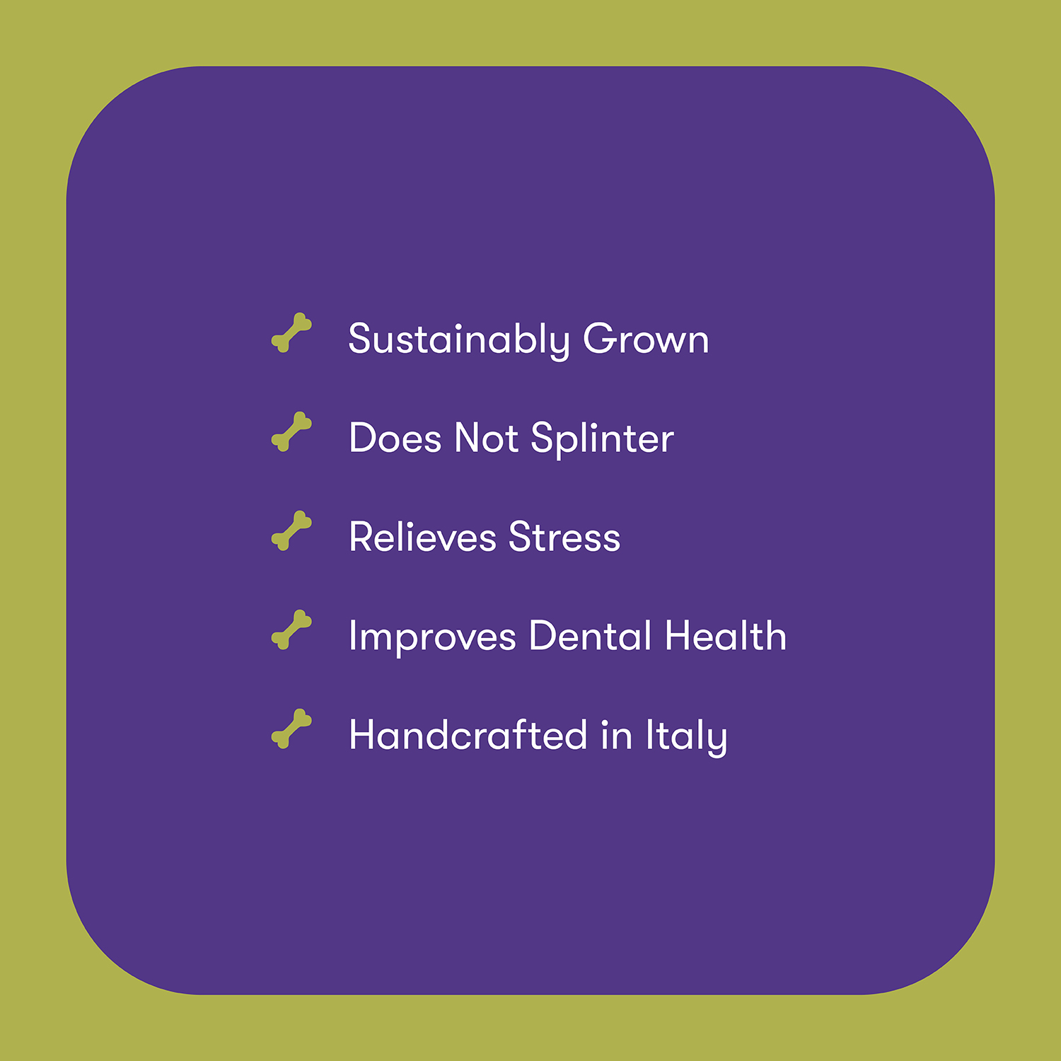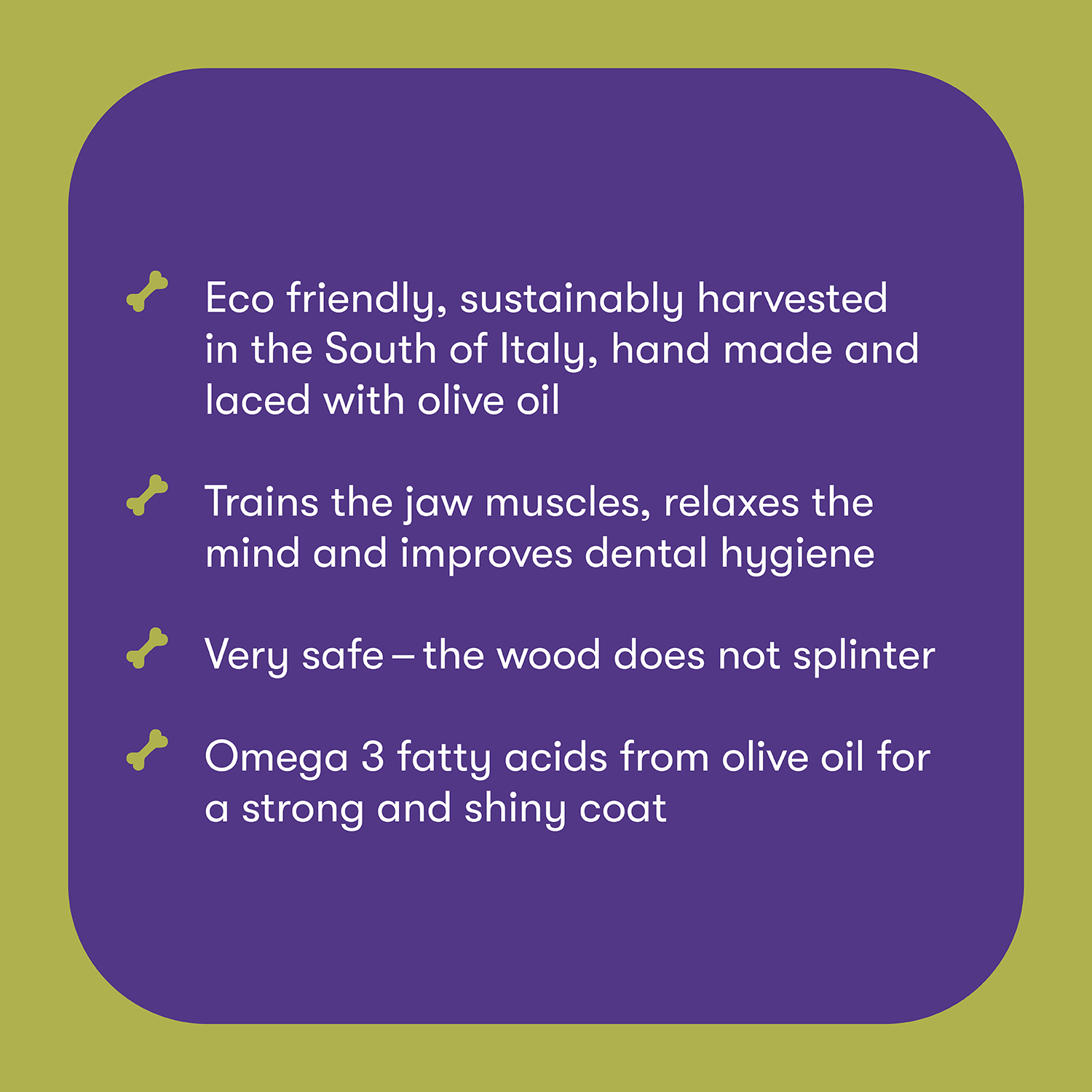 Handcrafted in Italy, 100% natural, safe, durable, strengthens teeth, relieves stress through a dog’s natural instinct to chew, treated with extra virgin
