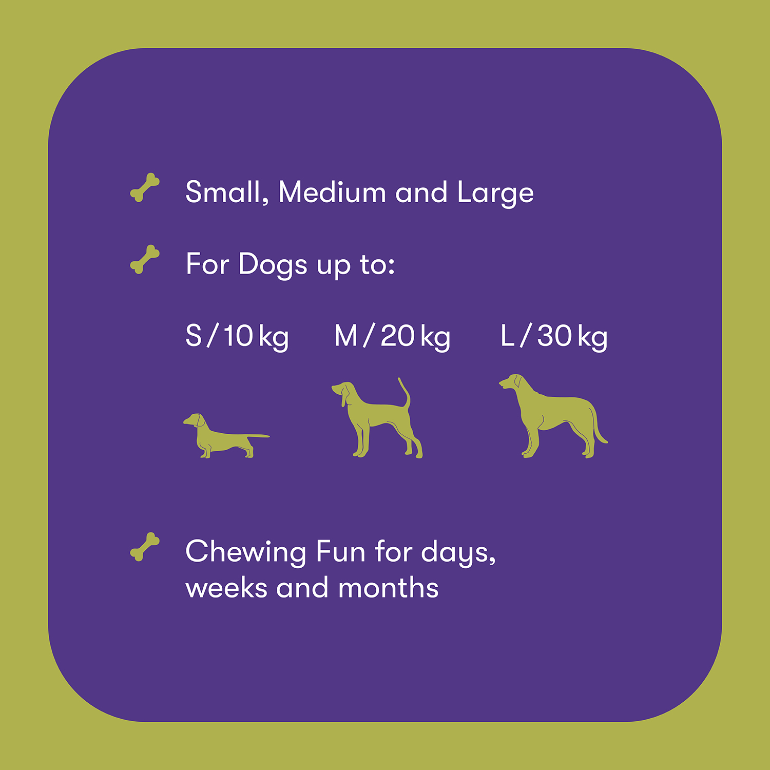 olive oil, produced from sustainable wood sources. Sizes rang from small (for dogs up to 10kg), medium (for dogs up to 20kg) and large (for dogs up to 30kg).