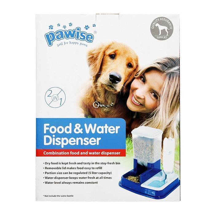 The PAWISE 2-in-1 Food & Water Dispenser is a convenient way of feeding your pet when you are away from home or want to regulate their intake of food. The food storage compartment keeps dry food fresh and can be dipsensed a little at a time or can be regulated to dispense certain amounts. Water is dispensed from a standard water bottle (not included) and flows freely maintaining a certain level of water at all times. Overall size of Food & Water Dispenser L 34cm x W 27cm x H 36cm. Water basin size 11cm x 12cm x 5cm. Feeding bowl size 15cm x 8cm x 5cm. Food container holds 5 ltrs.