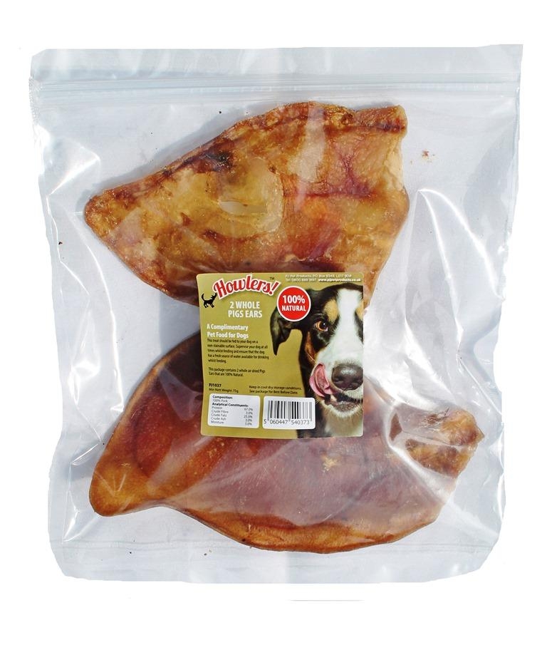 PJ Pet Products brings you Howlers! This 100% Natural Pigs Ears are packed in a sealed, clear bag with a Howlers branding label. 2 pieces per bag.  Minimum Nett Weight 80g.
