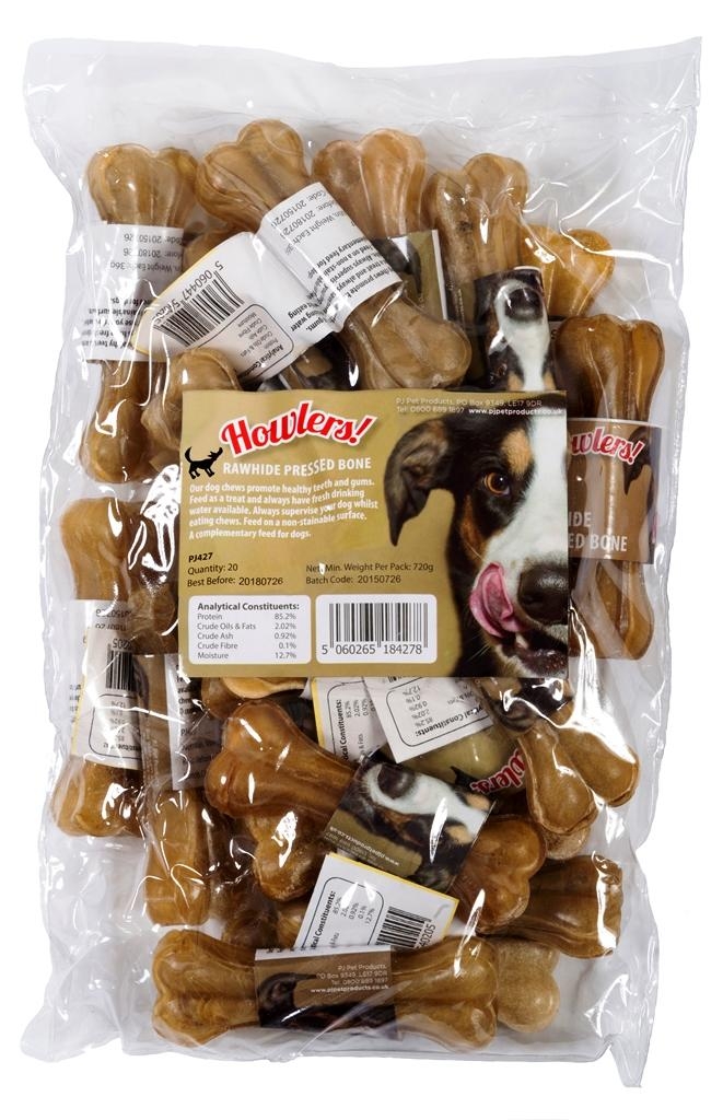 PJ Pet Products brings you Howlers! These Premier Rawhide Pressed Bones are 4 inches long and are packed in a bulk pack of 20.