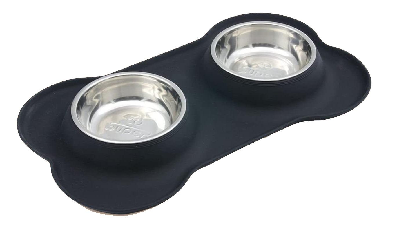 The Super Design Double Pet Bowl & Silicone Mat for Dogs and Cats comprises of a food grade silicone bone shaped mat with raised edges which help to contain any liquid or particles of food that have spilled out of the bowls. The anti-slip silicone mat also provides stability and will stay put on floor surfaces preventing any movement of the bowls either empty or full. The two removable bowls are made from food grade stainless steel. Practical and stylish, both the silicone mat and the stainless steel bowls are easily cleaned with a soft cloth or alternatively are dishwasher safe.  Available in 3 colours, Black, Blue & Orange & 3 sizes, Small and Medium. See Sizing below.